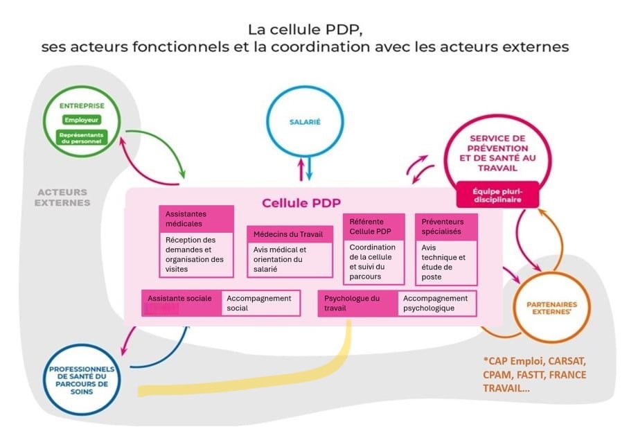 Des spécialistes peuvent s’associer à la cellule PDP, en lien avec le médecin du travail en charge du suivi du salarié et avec les autres acteurs (médecin conseil, médecin traitant, cellule de prévention de la désinsertion de l’assurance maladie, CARSAT, l’opérateur France Travail/ CAP Emploi, MDPH etc.).
